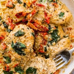 Creamy sauce, sun-dried tomatoes, and garlic make this feel like a dinner you’d get at a restaurant. It freezes beautifully and all you have to do is toss it in the slow cooker. Add pasta and you’re done.