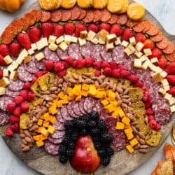 Gobble gobble your way to Thanksgiving dinner with the cutest turkey charcuterie board there ever was! Guests of all ages will love this fun way to enjoy a snack or appetizer full of meat, cheese, crackers, and lots of fruit!