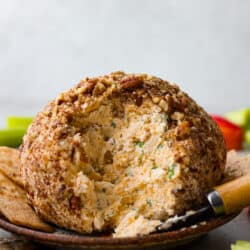This is my go-to classic cheese ball! It’s deliciously cheesy with cream cheese, cheddar cheese, green onion, and seasonings shaped into a ball and rolled in crunchy pecans. It’s packed with flavor and makes the best holiday appetizer!