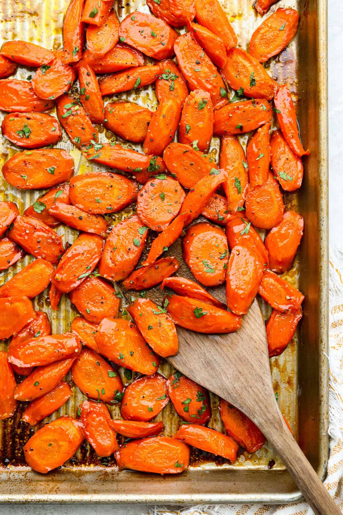 - Cook Carrots: Spread the carrots in an even layer on the baking sheet. Bake for 15 minutes, then stir the carrots in the pan. Bake for an additional 15 minutes, or until the carrots are tender and caramelized. Garnish with fresh chopped parsley if desired.