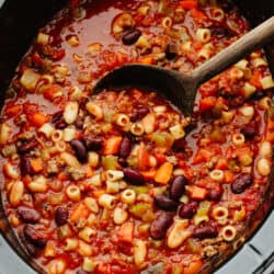 Slow cooker Pasta e Fagioli soup is a rich and hearty Italian soup loaded with pasta, vegetables, beans, and lean ground beef. It’s hearty, comforting, and oh so delicious!
