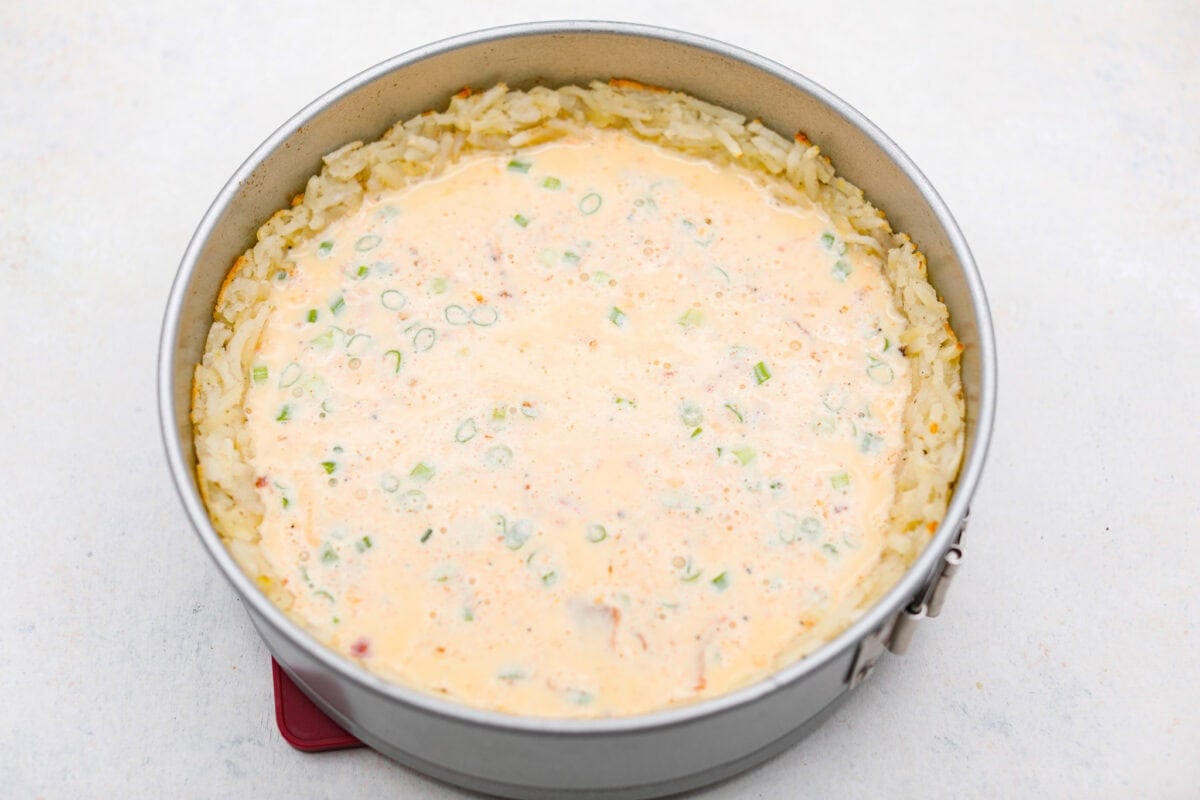- Freeze and Bake Crust: Press the hash browns into the bottom and halfway up the sides of the prepared springform pan. Really press it together to ensure there are no holes or gaps for the egg filling to leak out. Place the crust in the freezer for at least 1 hour. Once the crust is frozen, then preheat the oven to 425ºF. Bake for 18-20 minutes or until the edges of the hash browns begin to brown.