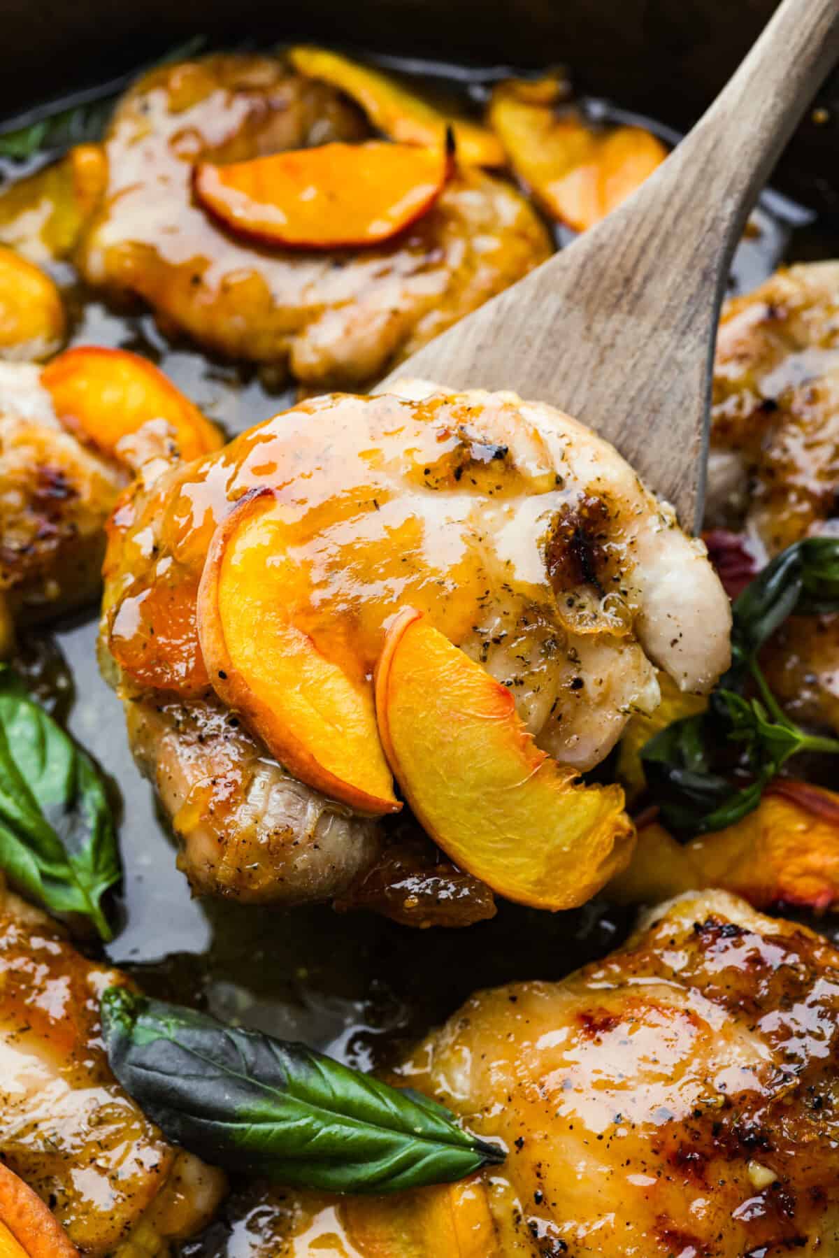 4. Place in the Oven: Return the browned chicken to the pan and then nestle it into the sauce. Layer the sliced peaches on top of the chicken and sauce. Place the skillet into the oven, then cook for 15-20 minutes. The peaches will soften, and the chicken should reach an internal temperature of 165ºF. Top with fresh basil leaves for garnish and enjoy!