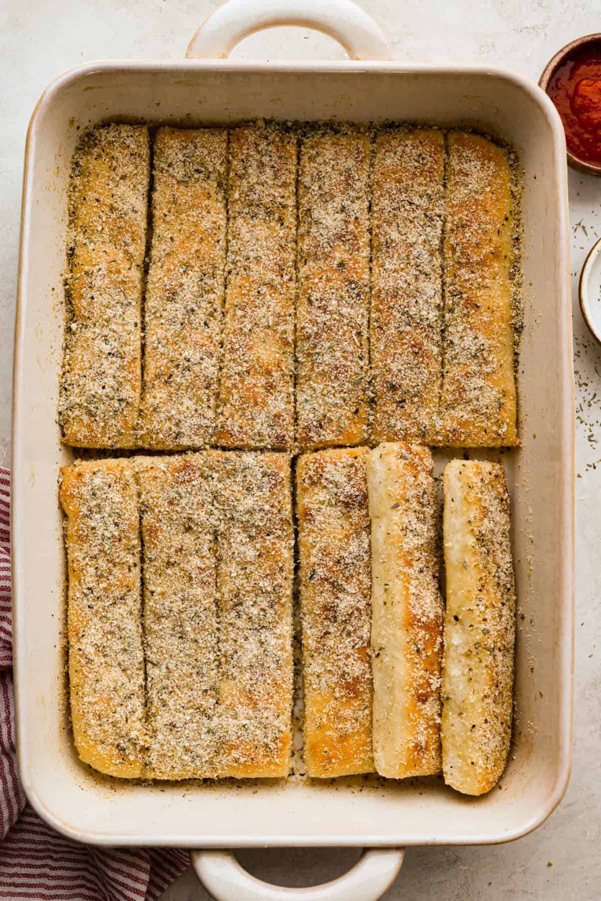 • When the dough is ready to bake, cut it into 12 equal sticks. Bake the breadsticks for 15-18 minutes until the bread is golden brown and baked through. Remove the breadsticks from the oven.