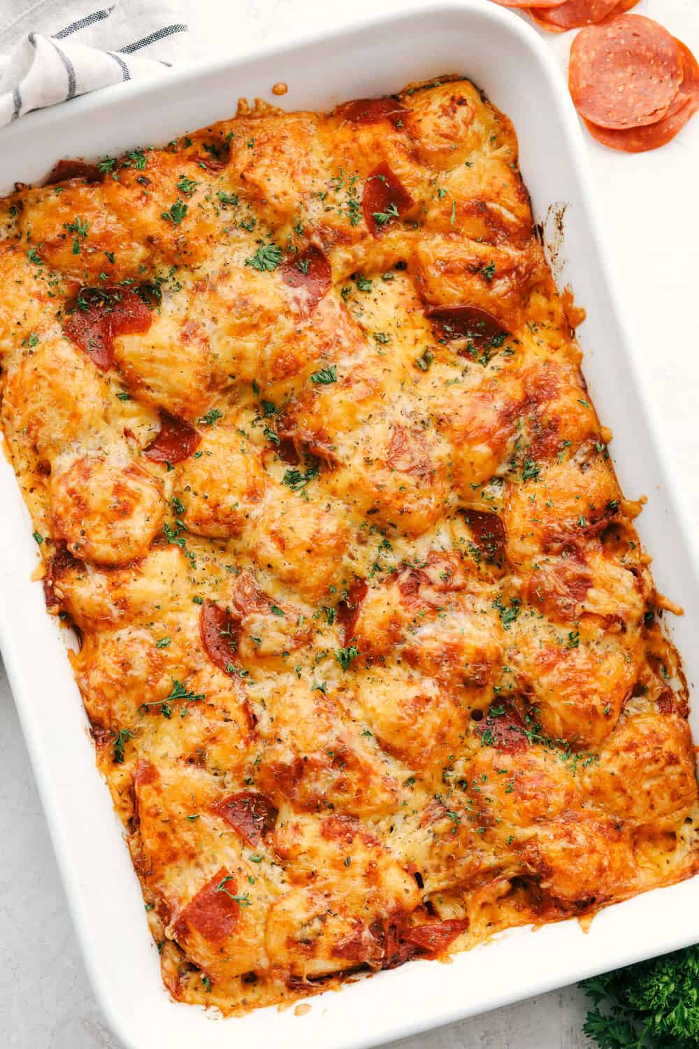 - Fold and Bake: Carefully fold the pointed ends of the crescent rolls over to the center of the ring and tuck them underneath the dough to secure and seal it. Brush the top of the rolls with melted butter, then sprinkle the Italian seasoning and parmesan evenly over the top. Bake for 18-20 minutes, until a deep golden brown color. Let the pizza ring cool for 5-10 minutes before slicing and serving with additional pizza sauce or ranch for dipping.
