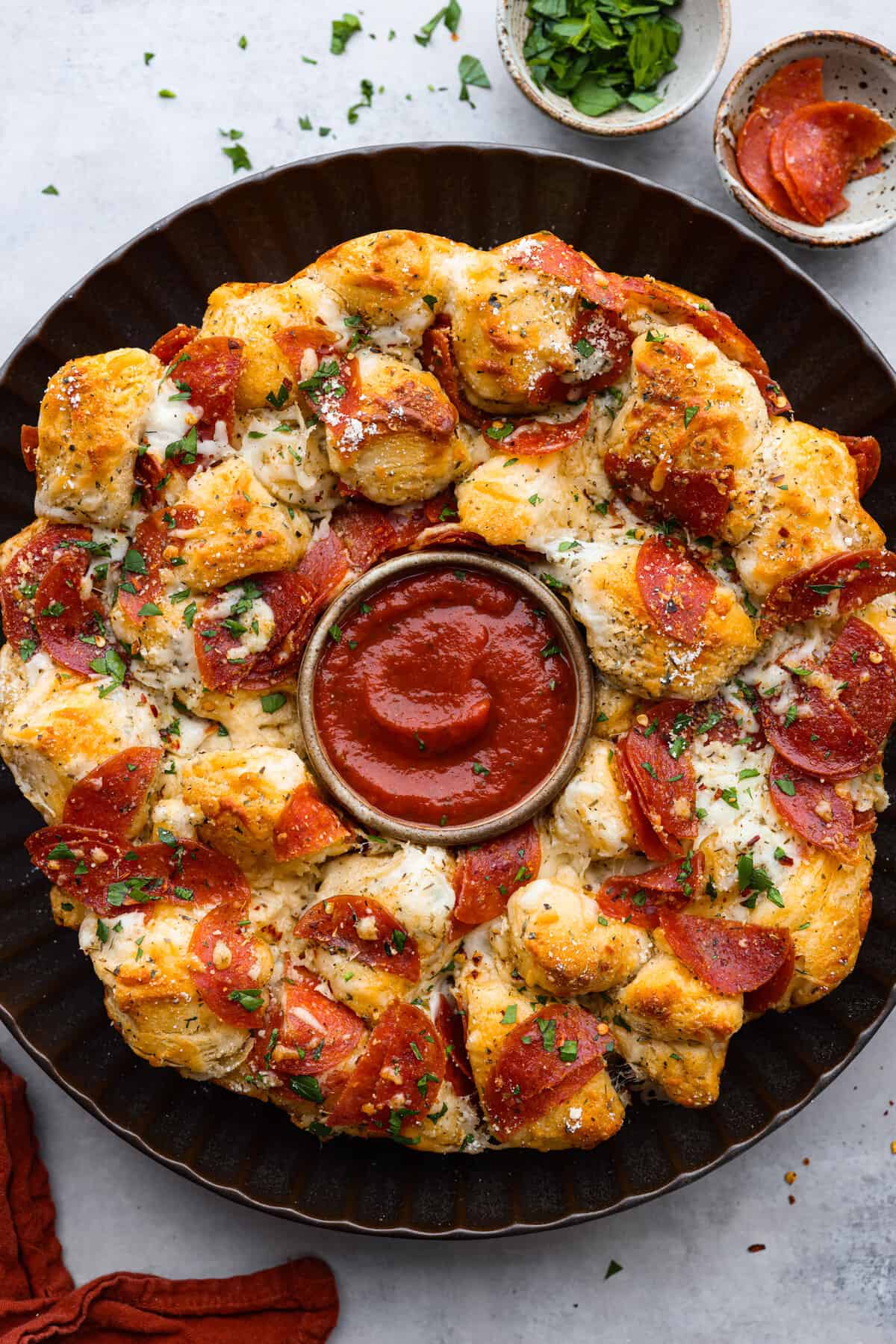 Bake for 18-20 minutes, until a deep golden brown color. Let the pizza ring cool for 5-10 minutes before slicing and serving it with extra pizza sauce for dipping.