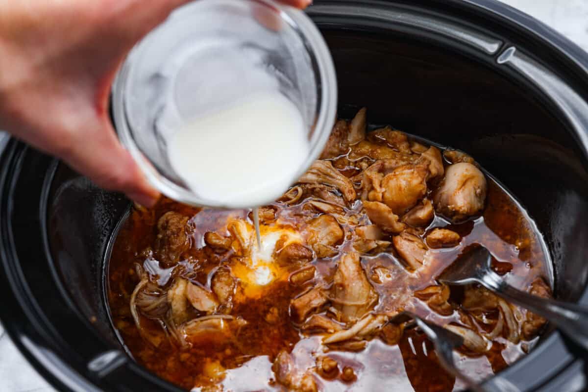 Use two forks to shred the chicken in the slow cooker. Whisk together 2 tablespoons cornstarch and 2 tablespoons water in a small bowl, then add to the slow cooker and stir to incorporate. Cover and cook for 20-30 minutes, until the sauce thickens.