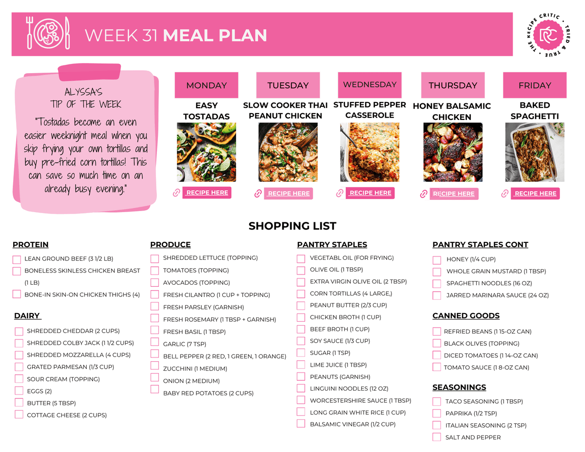 This week’s meal plan is here to save you time and stress with simple, delicious dinners the whole family will love! From easy tostadas to baked spaghetti, these recipes are perfect for busy weeknights, and the organized shopping list makes meal prep a breeze.