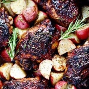 Glazed Honey Balsamic Chicken with Potatoes is a one pan meal with tender and juicy chicken glazed in a sweet and tangy honey balsamic sauce. Surrounded by crisp and tender potatoes this is one delicious meal!