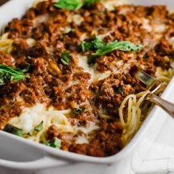 Classic Baked Spaghetti is the delicious casserole version of the traditional pasta and meat sauce. With multiple layers of cheesy buttered noodles, melted mozzarella cheese, and onion beef sauce you’ll want to make this a new family favorite.