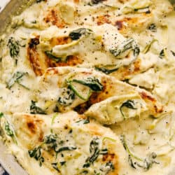 Pan seared chicken is smothered in a decadent sauce with spinach and artichokes in this Creamy Spinach Artichoke Chicken. It’s a quick simple way to put a gourmet meal on the table any day of the week. Not only is it quick to make, it’s made all in one pot so clean up is a breeze.