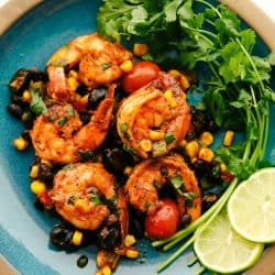 Mexican Shrimp Skillet is full of thick, plump shrimp with black beans, golden yellow corn, ripe cherry tomatoes, chopped bell peppers, black olives mixed together in my famous taco seasoning all in sautéd in one pan. All under 20 minutes!