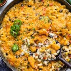 Creamy, cheesy Cowboy Mac and Cheese gets a bold twist with hearty additions like seasoned meat, tomatoes, jalapeños, corn, beans, and onions.