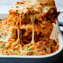 Baked spaghetti is different because the noodles absorb the rich sauce while it bakes, giving every bite a deeper flavor you won’t get from stovetop spaghetti.