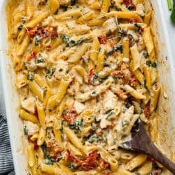 Enjoy the best of both worlds with my creamy, cheesy Tuscan Chicken Pasta Bake, which combines your love for Tuscan chicken and casseroles!