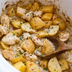 This Slow Cooker Parmesan Garlic Chicken and Potatoes has juicy chicken, tender potatoes, and a rich, creamy parmesan garlic sauce.