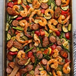 Cajun shrimp and sausage vegetable sheet pan is so incredibly easy that it makes a perfect weeknight meal! It’s bursting with amazing Cajun flavor! This is a healthy and delicious one-pan dinner full of shrimp, sausage, and veggies.