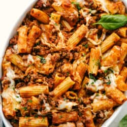 Baked Rigatoni is full of zesty meat, tender noodles and lots of cheese! Super simple and incredibly delicious, this is the ultimate comfort food!