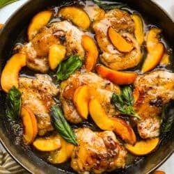 Juicy chicken coated in a sweet, sticky peach glaze is an easy skillet dinner that is full of fresh flavor and comes together in just 35 minutes!