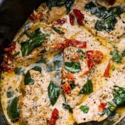 Crockpot Tuscan Chicken is delicious juicy and tender chicken breast cooked in a creamy parmesan and sun dried tomato sauce. It takes 10 minutes to prep and the smells alone will have your family asking when dinner is!