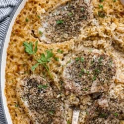 No Peek Pork Chops and Rice is comfort food at its best! Creamy, savory rice and tender pork chops are baked together in the same pan with less than 10 minutes of prep.